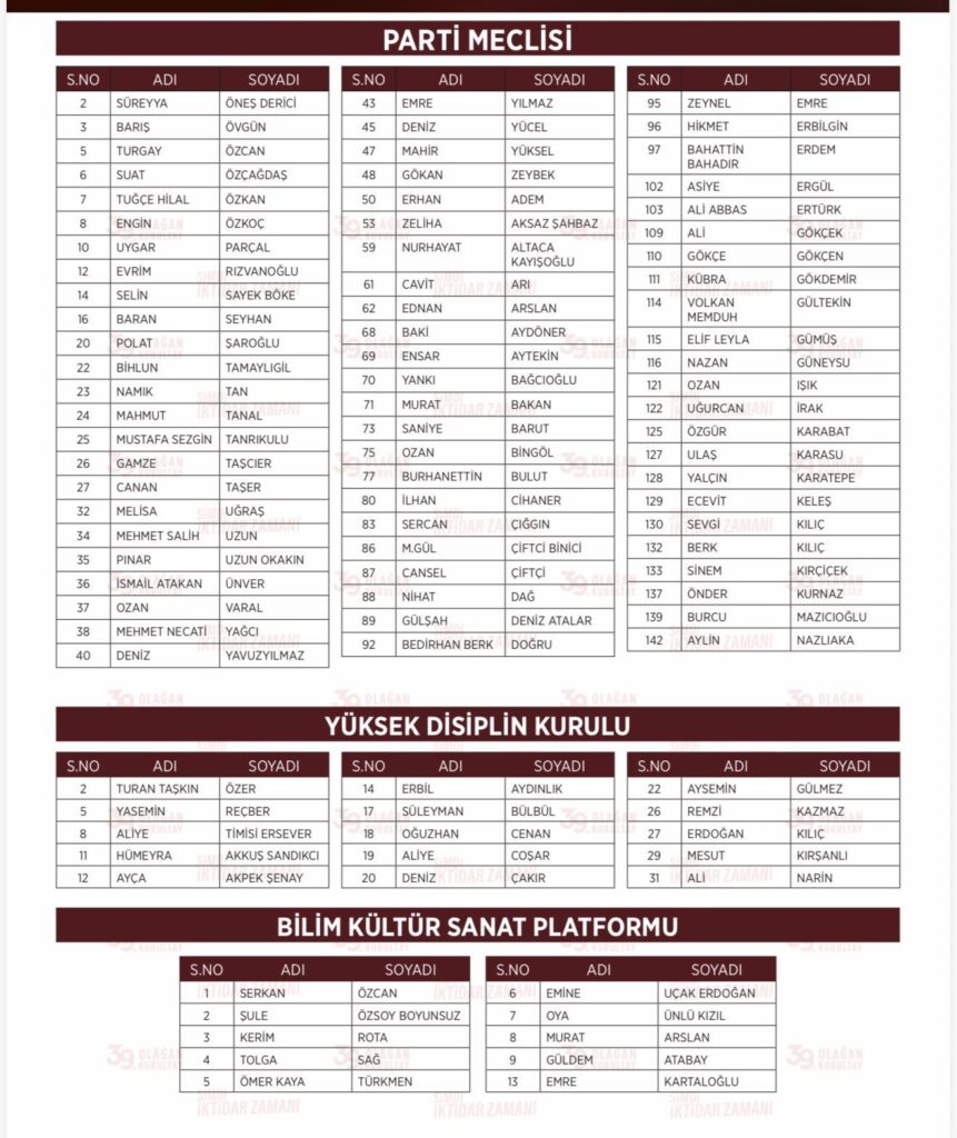 Kurultay’ın üçüncü gününde ise partinin kayıtlı 1385 delegesi, Parti Meclisi (PM) ve Yüksek Disiplin Kurulu (YDK) asıl ve yedek üyelerini seçecek.