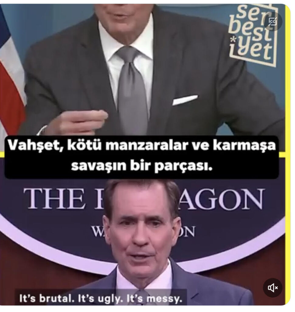 Beyaz Saray Sözcüsü John Kirby-2023 / Gazze: Sivil ölümler, vahşet savaşın bir gerçeği. Hoşumuza gitmese de gerçek bu. John Kirby-2022/ Ukrayna: Rus ordusunun Ukrayna’da yaptıklarını kimse etik zeminde meşrulaştıramaz. Bunlara bakmak… Pardon...