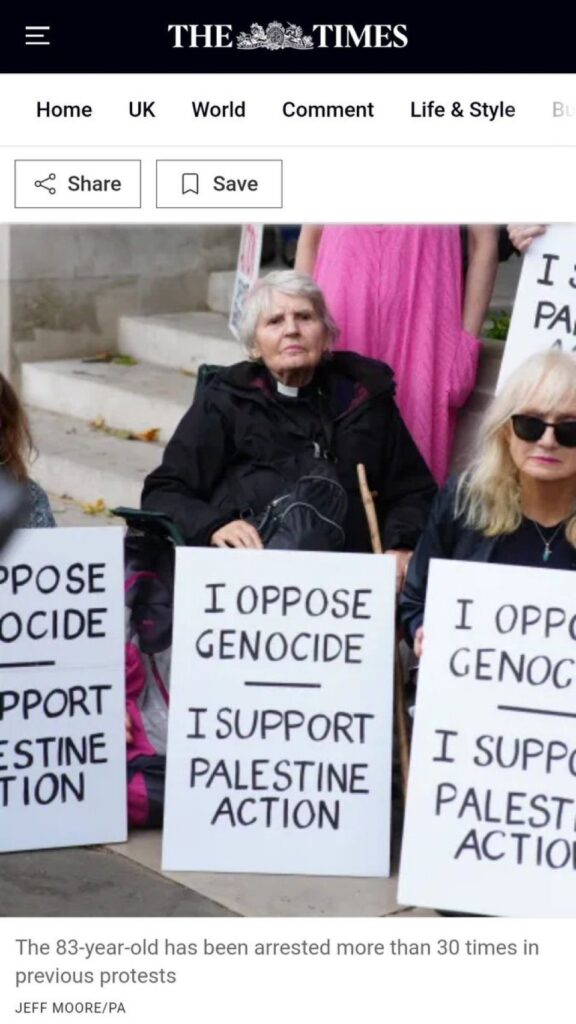Temmuz 2025’te İngiltere hükümeti, İsrail’e silah sağlayan şirketlere yönelik doğrudan eylemlerle gündeme gelen Palestine Action adlı grubu yasaklı örgüt ilan etti. Bu kararın ardından grup lehine her türlü destek açıklaması ve pankart, Terörizm Yasası kapsamında suç sayılmaya başlandı. Parfitt de bu yasa kapsamında daha önce birkaç kez gözaltına alınmış ve “80 yaşında birine terörist muamelesi yapılmasının şok edici olduğunu” söylemişti.