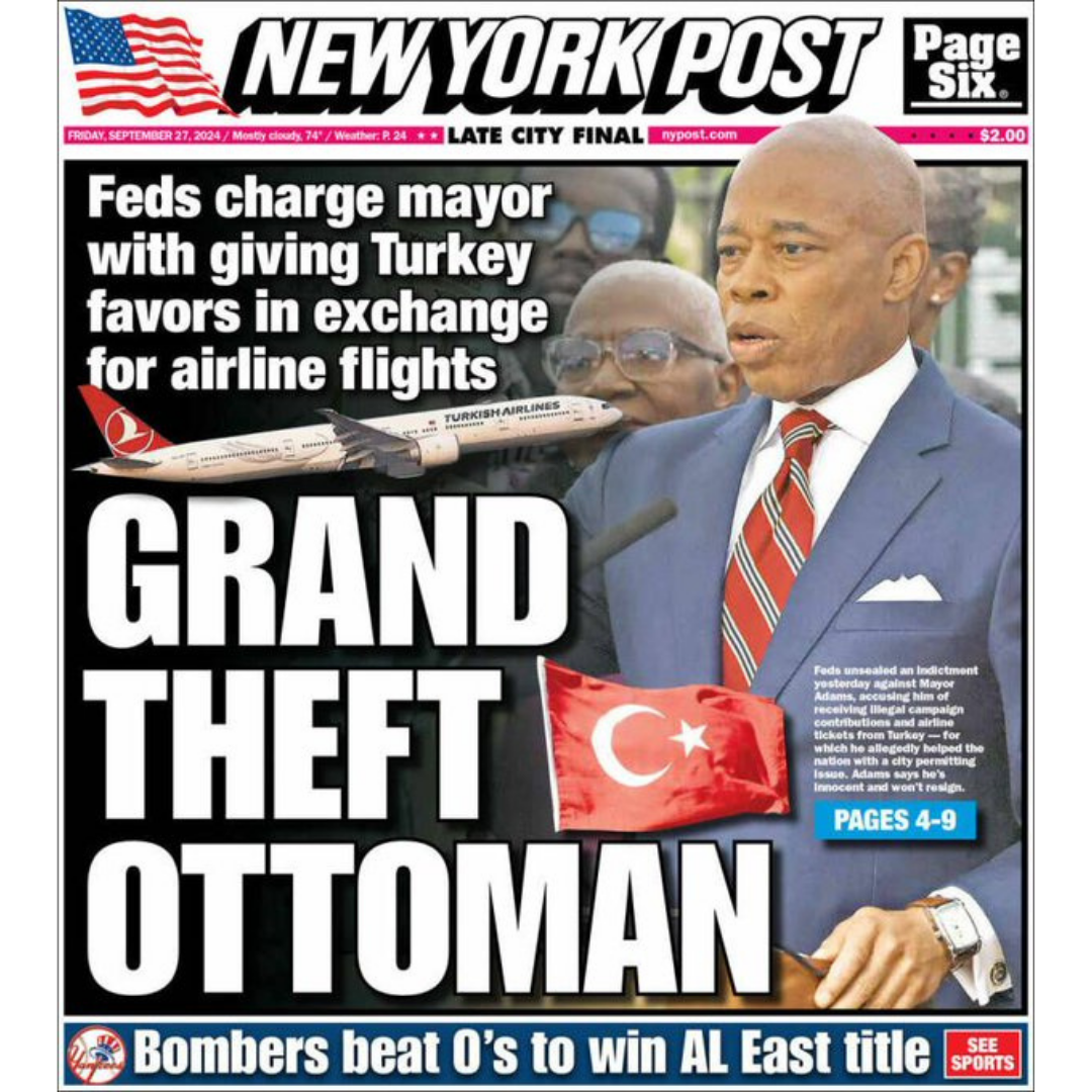 New York Post, Adams için “Grand Theft Auto” (Büyük araba hırsızlığı) oyununa gönderme yaparak “Grand Theft Ottoman” (Büyük Osmanlı hırsızlığı) manşeti attı.