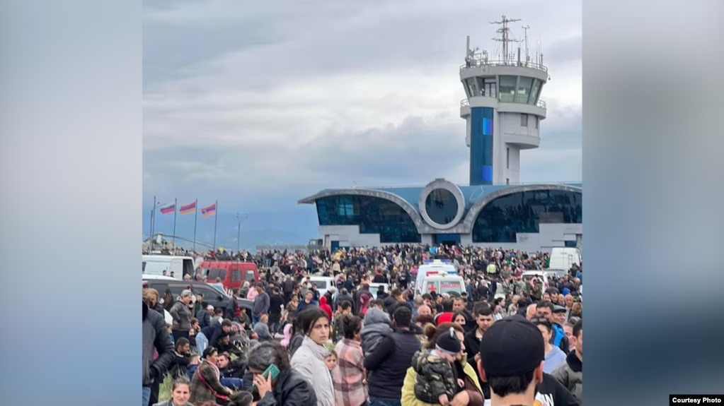 Karabağ’daki siviller, bölgeden ayrılmak için Hankendi’deki havalimanında toplandı.