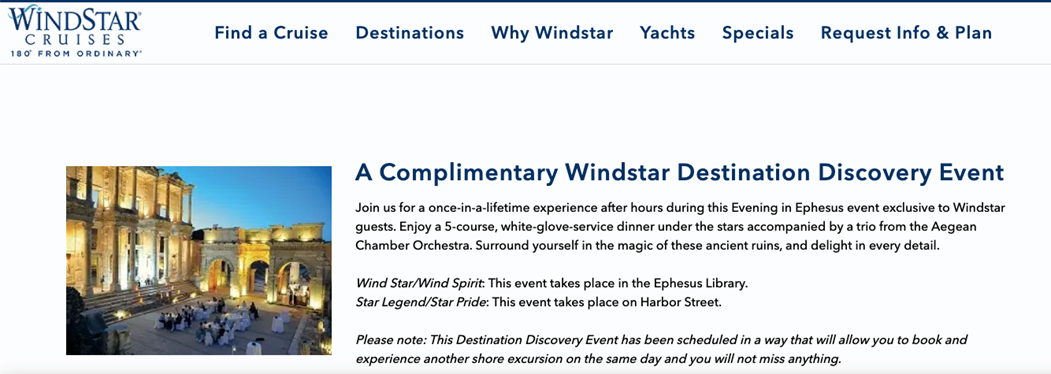 “Bu özel etkinlikte, Ege Oda Orkestrası size serenat yaparken Roma kalıntılarıyla çevrili yıldızların altında yemek yiyerek hayatta bir kez yaşayabileceğiniz bir deneyimin keyfini çıkarın. Efes’e Windstar misafirlerinin tüm alanı kendilerine ayırdığı saatlerden sonra girin ve güzel örtülerle donatılmış masaları ve tam zamanında batan güneşi bulun. Daha sonra beyaz eldivenle servis edilen yerel mutfaktan 3 çeşit yemek yerken kalıntılar aydınlanır. Her şey beklediğiniz gibi. Kalabalık yok. Acele yok.”