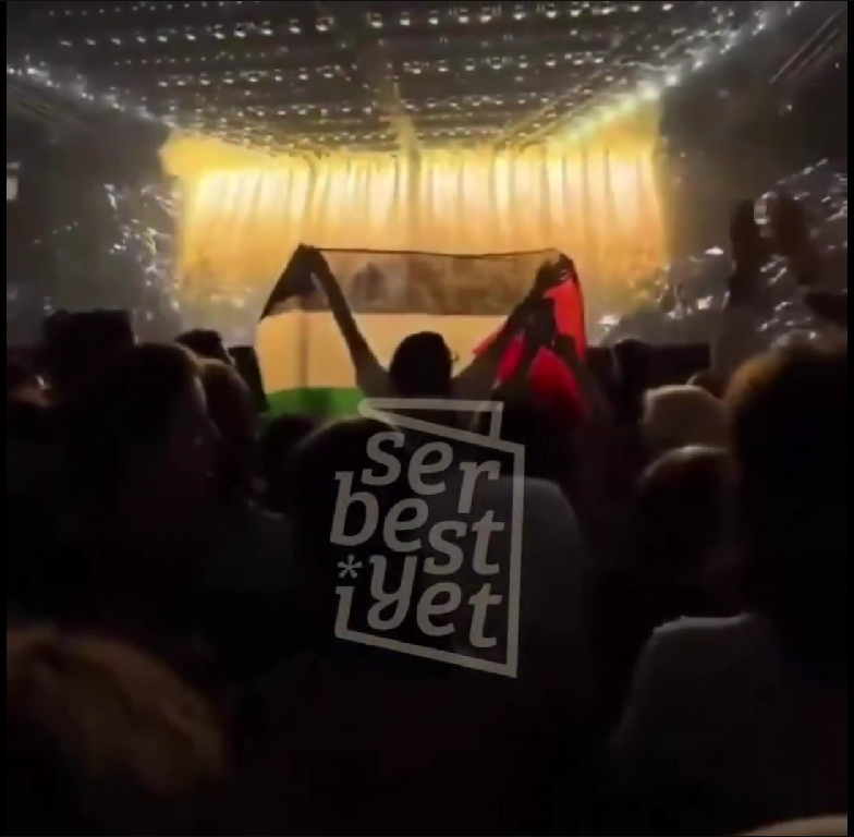 Raphael’in performansı sırasında salonda bulunan aktivistler ıslıklayarak ve Filistin bayrakları açarak protesto etti. Salondaki görevliler, protestoculara müdahale etti.