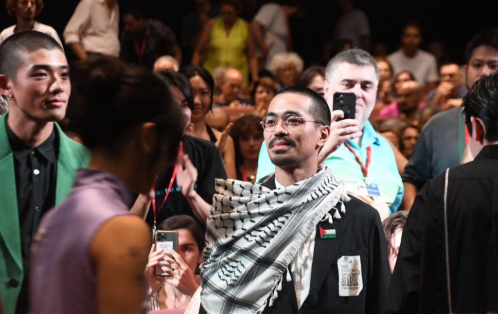 New York doğumlu Japon yönetmen Neo Sora, Venedik Uluslararası Film Festivali’nde ilk kez gösterilecek Happyend filminin galasına kefiye, Filistin bayrağı ve ‘Özgür Filistin’ yazısıyla katıldı.