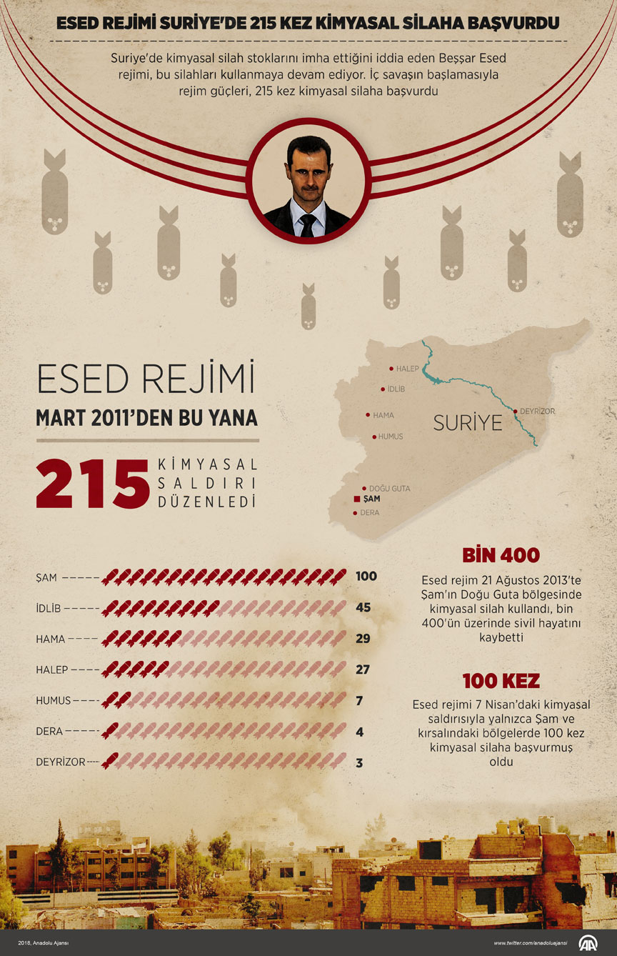 Ağ, Esad rejimi iç savaşın başlamasından bu yana ülkenin farklı bölgelerine toplam 214 kez kimyasal silahla saldırısına başvurduğunu dile getirmişti. Dünkü saldırısıyla bu sayı 215’e yükseldi.