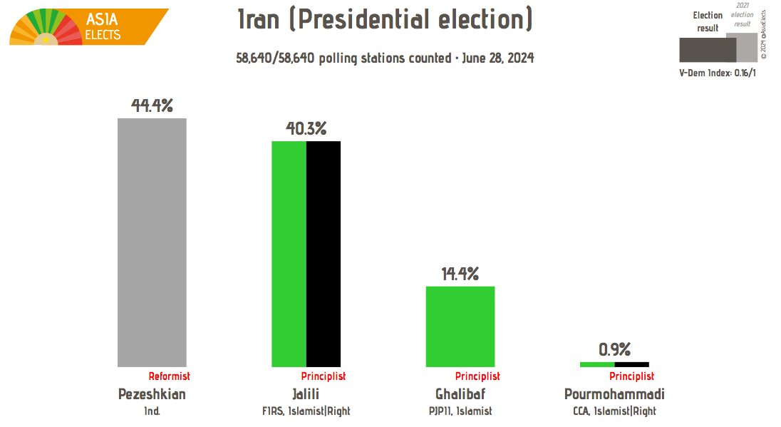 Seçim Merkezinin açıkladığı son verilere göre sayılan oylar 19 milyonu geçmişti. Oyların yaklaşık yüzde 43,5’ini alan reformist aday Mesut Pezeşkiyan yarışı önde götürüken, yakın rakibi muhafazakar Said Celili yüzde 37,7 oyla ikinci sıradaydı.