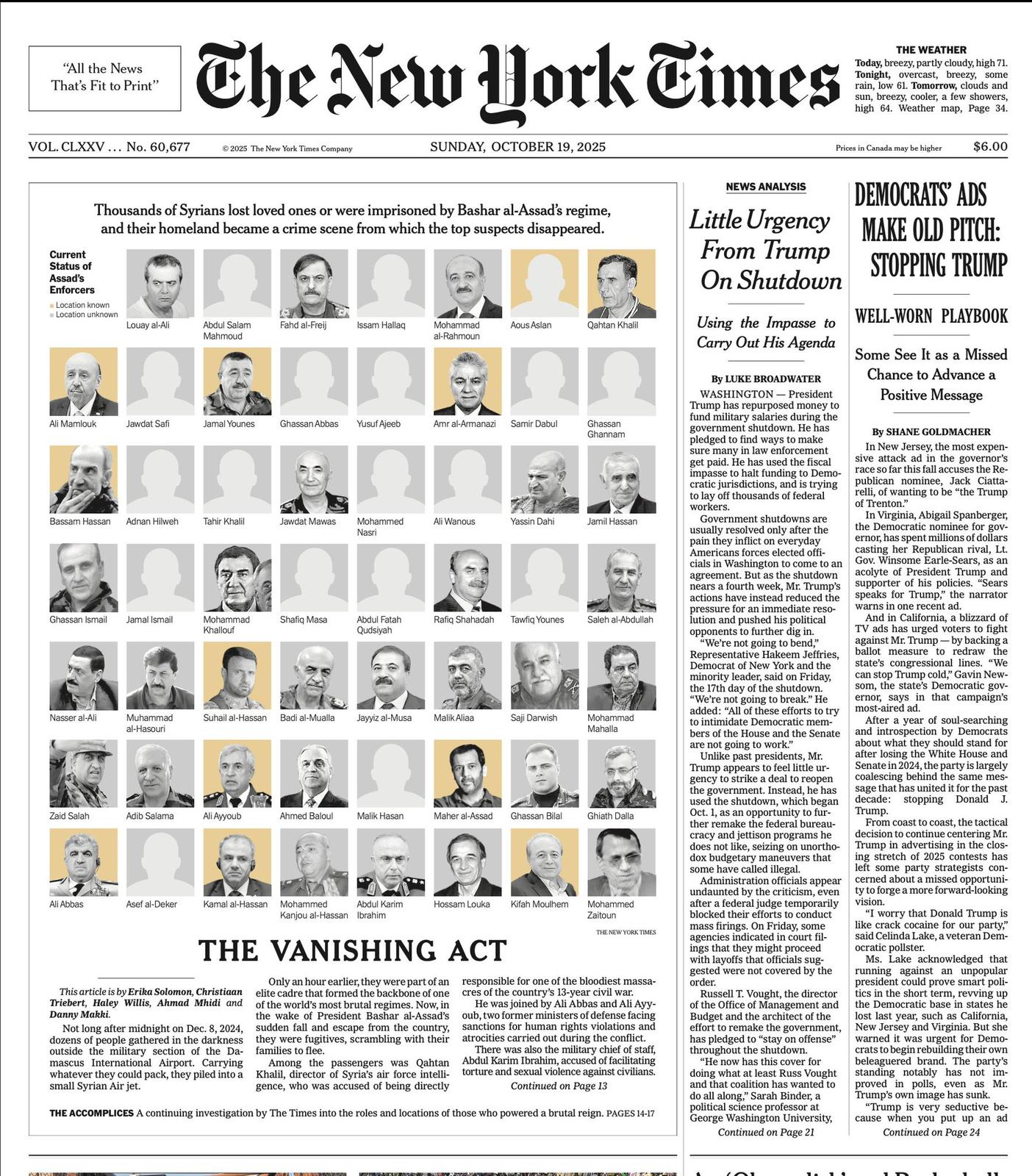 The New York Times, 19 Ekim 2025 tarihli manşetinde, Suriye’de Beşar Esad rejiminin üst düzey güvenlik kadrolarının izini süren kapsamlı bir araştırmayı yayımladı. “The Vanishing Act (Kaybolanlar)” başlıklı dosya, yıllarca işkence, kayıp ve katliamlardan sorumlu tutulan rejim görevlilerinin nasıl izlerini kaybettirdiklerini ortaya koyuyor.