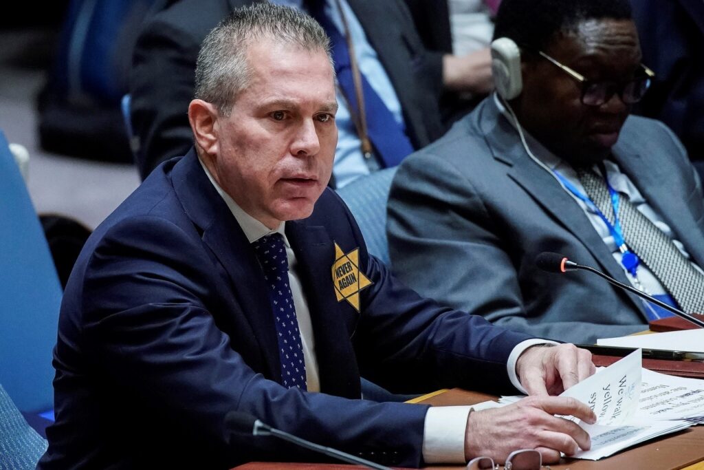 İsrail’in BM Daimi Temsilcisi Gilad Erdan, dün BM Güvenlik Konseyi’nde yaptığı konuşmada Hamas’ın 7 Ekim saldırıları konusunda dünyanın “sessizliğini” kınamak amacıyla sarı yıldız taktı.
