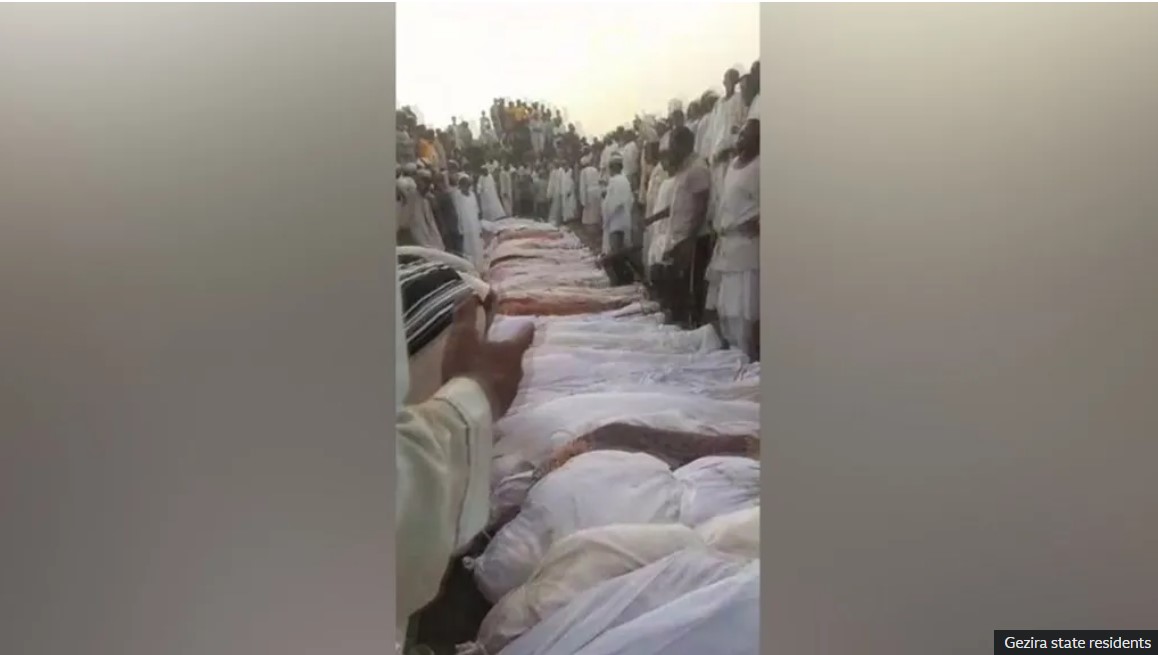 Çarşamba günkü baskının ardından sosyal medyada dolaşıma giren görüntülerde, Gezira eyaletindeki Vad el-Nura’da gömülmeye hazırlanan beyaz kefenlere sarılı düzinelerce ceset görülüyordu.