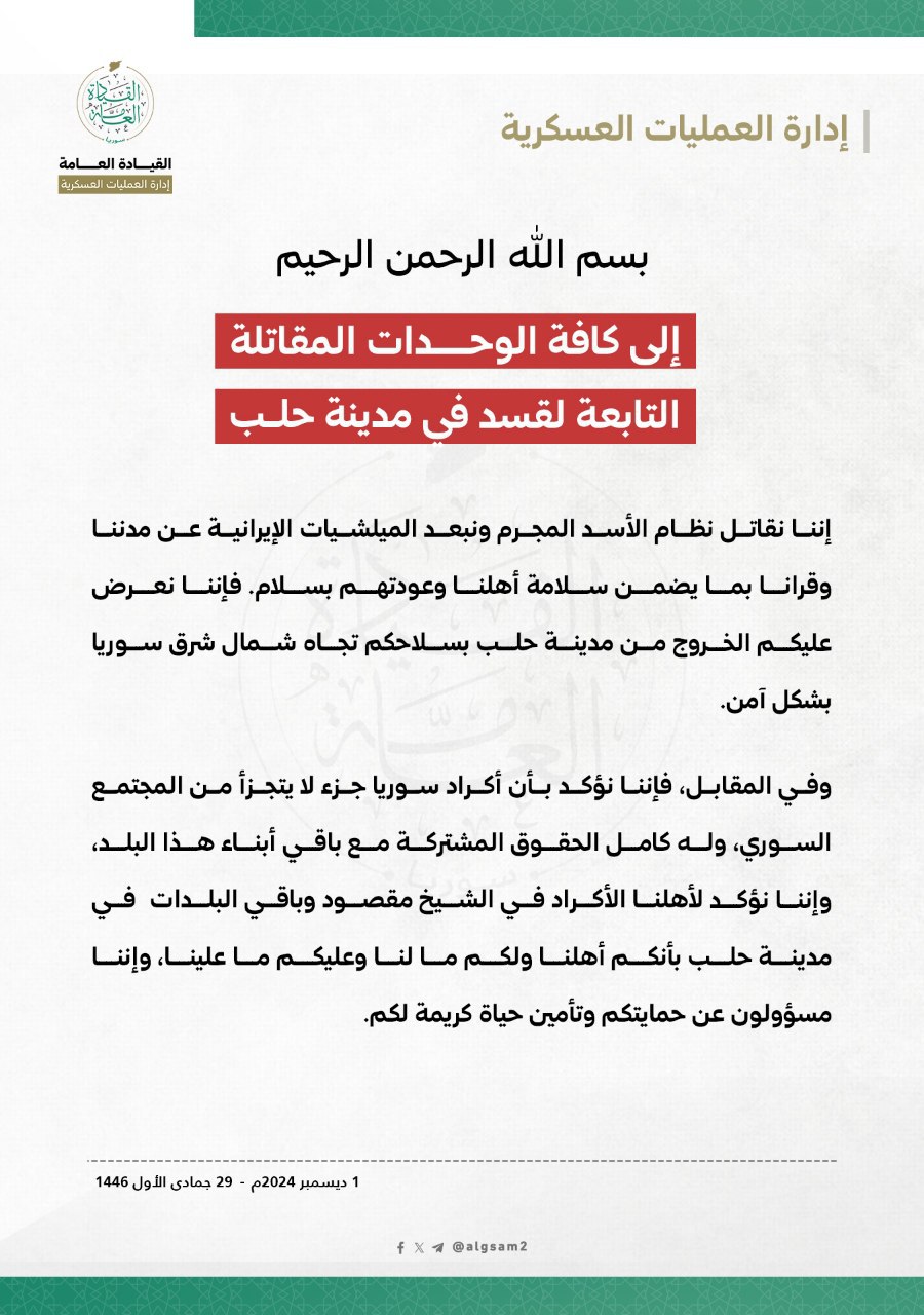HTŞ, yazılı bir bildiri yayımlayarak Halep’te bulunan YPG/SDG güçlerine güvenli bir şekilde ayrılma çağrısı yaptı.