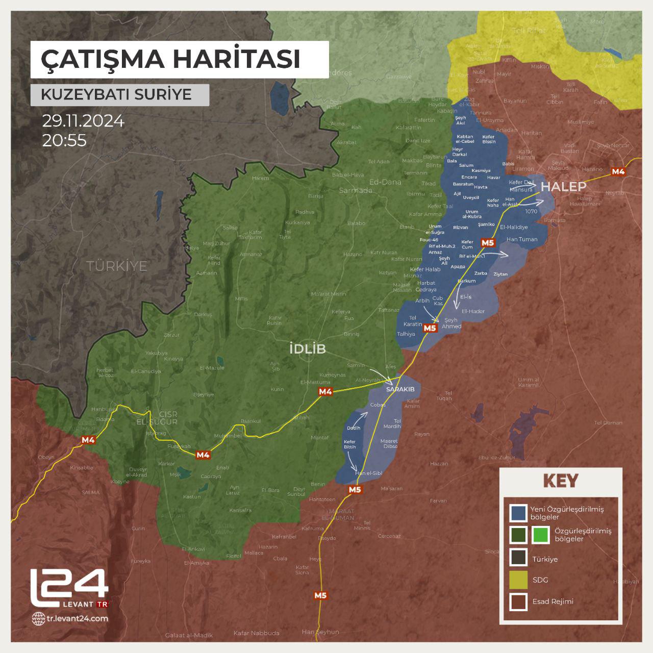 Çarşamba gününden bu yana sosyal medyada dolaşan görüntülerde Tahriru’ş Şam Heyeti (HTŞ) ve ona bağlı muhalif grupların önemli ilerlemeler kaydettiği, geniş toprakları ele geçirdiği ve Halep şehrinin dış mahallelerine doğru hızla ilerlediği görülüyor.