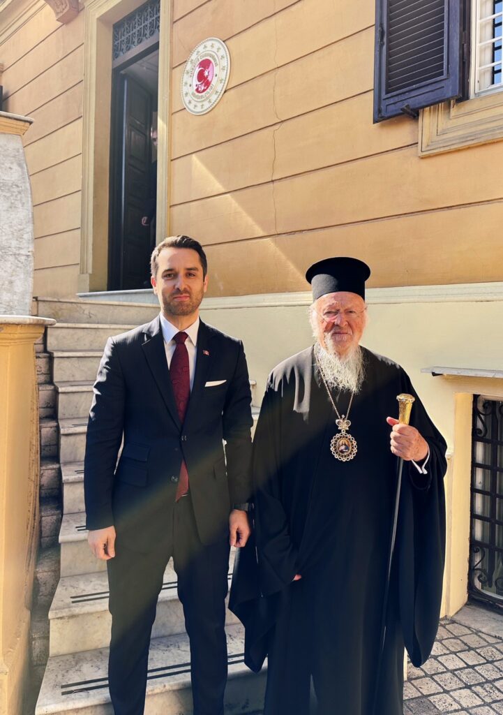 “Fener Rum Patriği Sayın I. Bartholomeos’u ve beraberinde bulunan İtalya Metropoliti Sayın Polykarpos, Patrikhane Özel Ofisi Direktörü Muhterem Aetios, Arkhon Sayın Stilianos Efstratiadis ve Vatikan’da Müsteşar Monsenyör Andrea Palmieri’yi bugün Büyükelçiliğimizde ağırladık. Teşrifleri için teşekkür ediyoruz.”