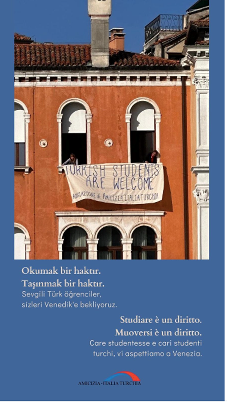 İtalyan-Türk Dostluk Derneği, İstanbul’daki protestolarla dayanışma amacıyla Venedik Ca’ Foscari Üniversitesi Asya ve Kuzey Afrika Çalışmaları Bölümü’nün penceresine pankart astı.