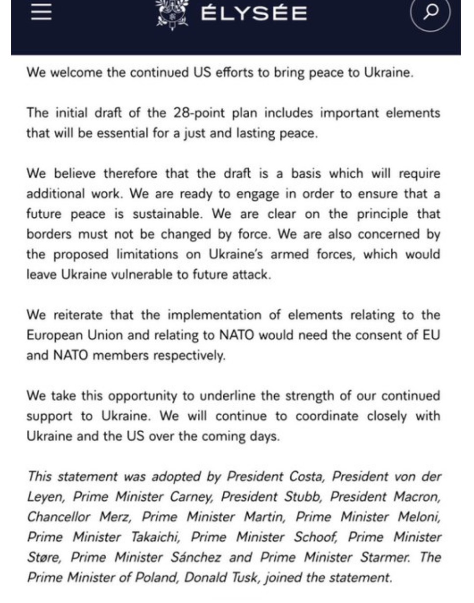 Batılı liderlerden de Trump’ın Ukrayna barış planına temkinli destek geldi. Aralarında Macron, Scholz, Meloni, Sánchez ve Starmer’ın da bulunduğu liderler taslağın “önemli unsurlar” taşıdığını ancak “ek çalışmaya ihtiyaç duyduğunu” vurguladı. Batılı liderler, taslakta Ukrayna ordusuna getirilen kısıtlamaların Kiev’i “gelecekteki saldırılara açık bırakabileceği” uyarısında bulundu.