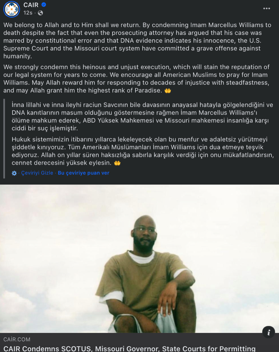 ABD’deki en büyük Müslüman hakları savunucu örgütü CAIR, Williams’ın infazının durdurulması için başlattığı kampanyada 50 bine yakın imza toplamıştı.