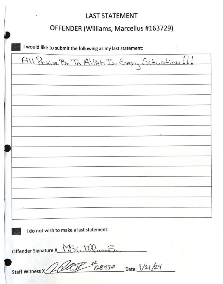 ABD'de kesin kanıt olmamasına rağmen 26 yıl önce işlenen bir cinayetten sorumlu tutularak ölüm cezasına çarptırılan ama yeni kanıtlarla savcıların 'masum da olabileceğini' belirttiği siyahi imam Marcellus Williams idam edildi. Williams’ın öldürdüğü iddia edilen kadının ailesi ve pek çok jüri üyesi idama karşı çıkmıştı. Williams’ın son sözleri: “Her türlü durumda Allah’a hamdolsun.”