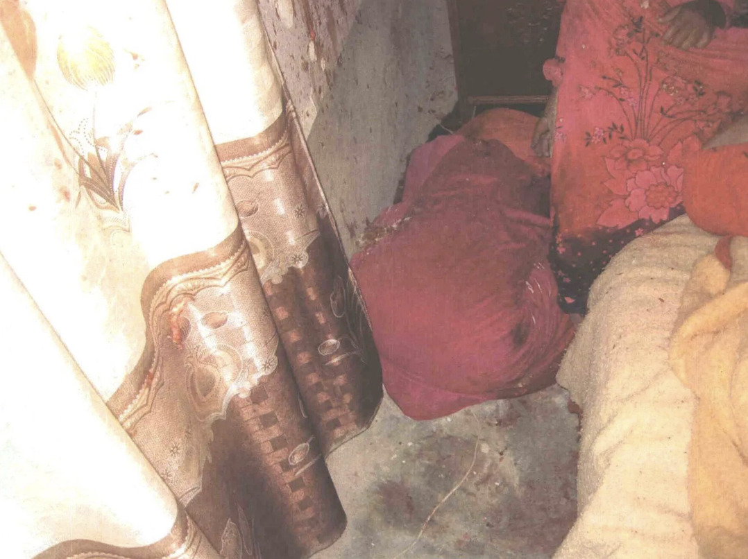Esma, oğlu Abdullah ve diğer iki aile üyesinin öldürüldüğü oturma odasının daha geniş bir görünümü. 43 yaşındaki Cahit Abdulhamid Hasan’ın cesedi ön planda duvara yaslanmış durumda. Bir askeri adli tabip, Cahit’in vurulduğunda muhtemelen duvara yaslanmış ya da oturuyor olduğu sonucuna vardı. Onun arkasında, odanın köşesinde Esma ve Abdullah’ın cesetleri var. Amerikan askerleri bu fotoğrafı Abdullah’ın cesedini taşıdıktan sonra çekmişler. Sonuç olarak, bu görüntüde annesinin kolu artık sırtında değil.