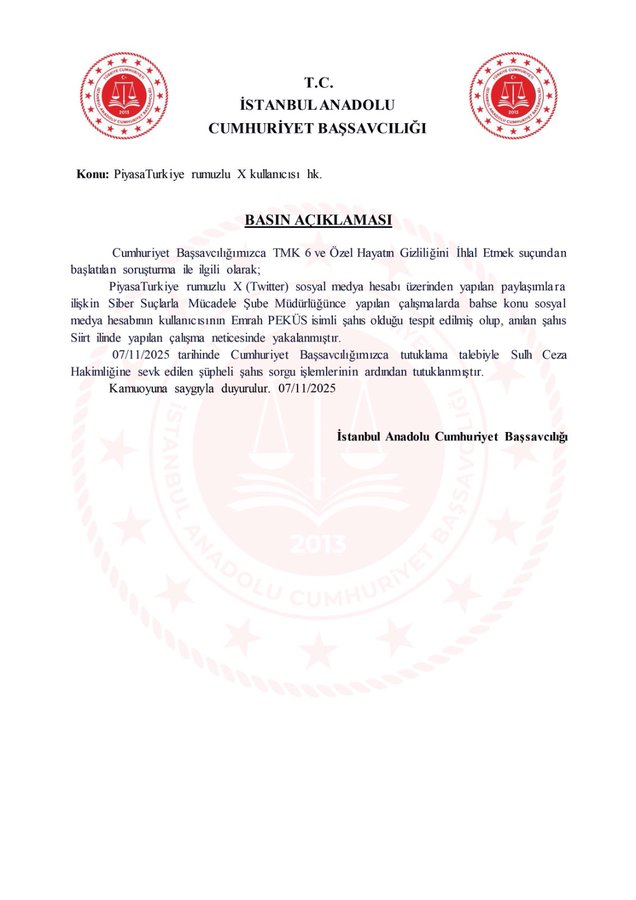 İstanbul Cumhuriyet Başsavcısı Akın Gürlek ve eşi Elif Gülşah Gürlek’in fotoğrafının sosyal medyadan paylaşılması ile ilgili “Terörle Mücadelede Görev Almış Kişileri Hedef Göstermek’ ve ‘Özel Hayatın Gizliliğini İhlal Etmek” suçundan soruşturma başlatıldı. Siber Suçlarla Mücadele Şube Müdürlüğünce yapılan çalışmalar sonucunda ‘Piyasa Türkiye’ rumuzlu X hesabının kullanıcısı 6 Kasım’da Siirt’te gözaltına alındı.