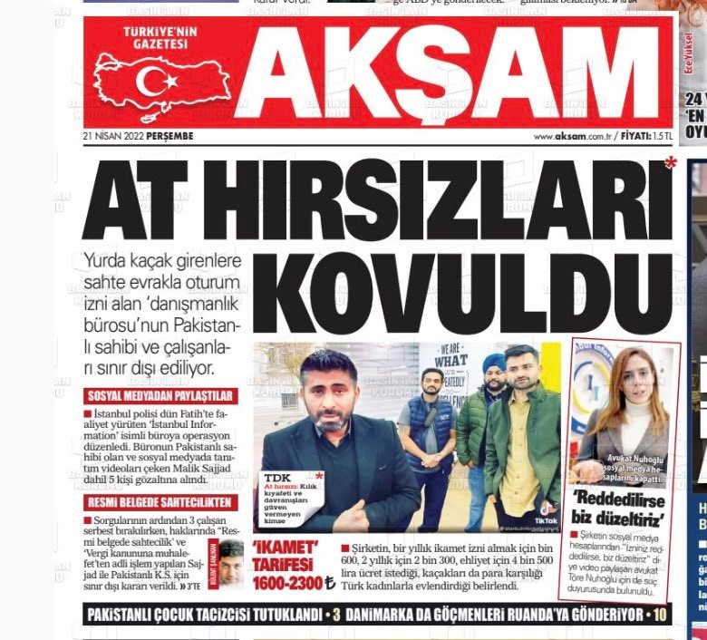 Akşam gazetesi, Türkiye’ye kaçak yollardan gelen Pakistanlıların oturum izni almasına yardım eden ve sosyal medyada gündem olan ‘İstanbul Information’ firmasının Pakistanlı olan sahibi ile yine Pakistanlı çalışanının sınır dışı edileceğini “At hırsızları kovuldu” manşetiyle duyurdu.