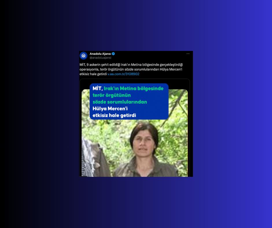 Anadolu Ajansı bugün yayınladığı bir haberde MİT tarafından Irak’ın Metina bölgesine yaptığı operasyon sonucunda PKK’nın yöneticilerinden Hülya Mercen’in öldürüldüğünü duyurdu.