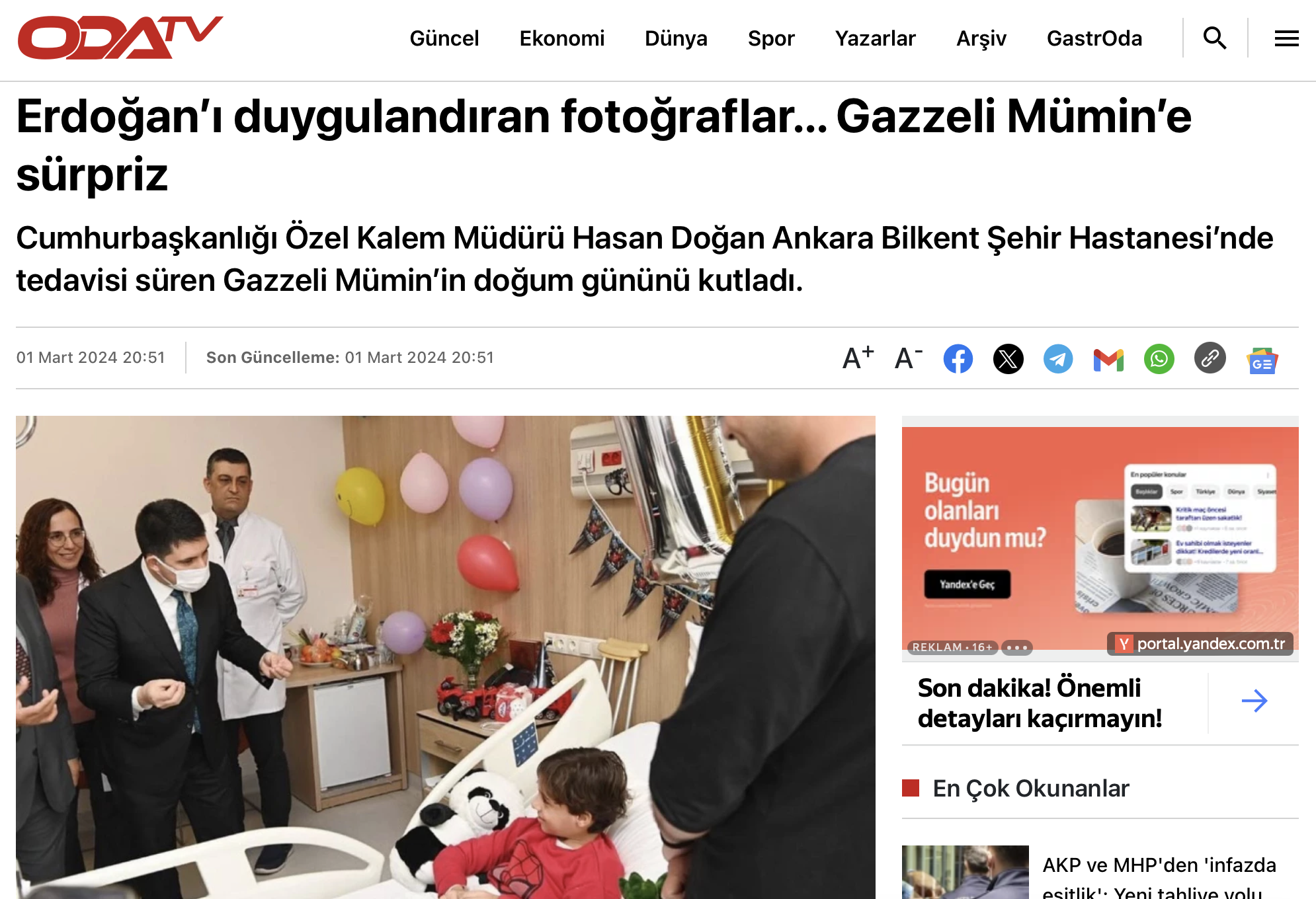 Mart 2024’te ise Hasan Doğan’ın Ankara Bilkent Şehir Hastanesi’nde tedavi görmekte olan Gazzeli bir çocuğu ziyareti, “Erdoğan’ı duygulandıran fotoğraflar” başlığıyla haber oldu.