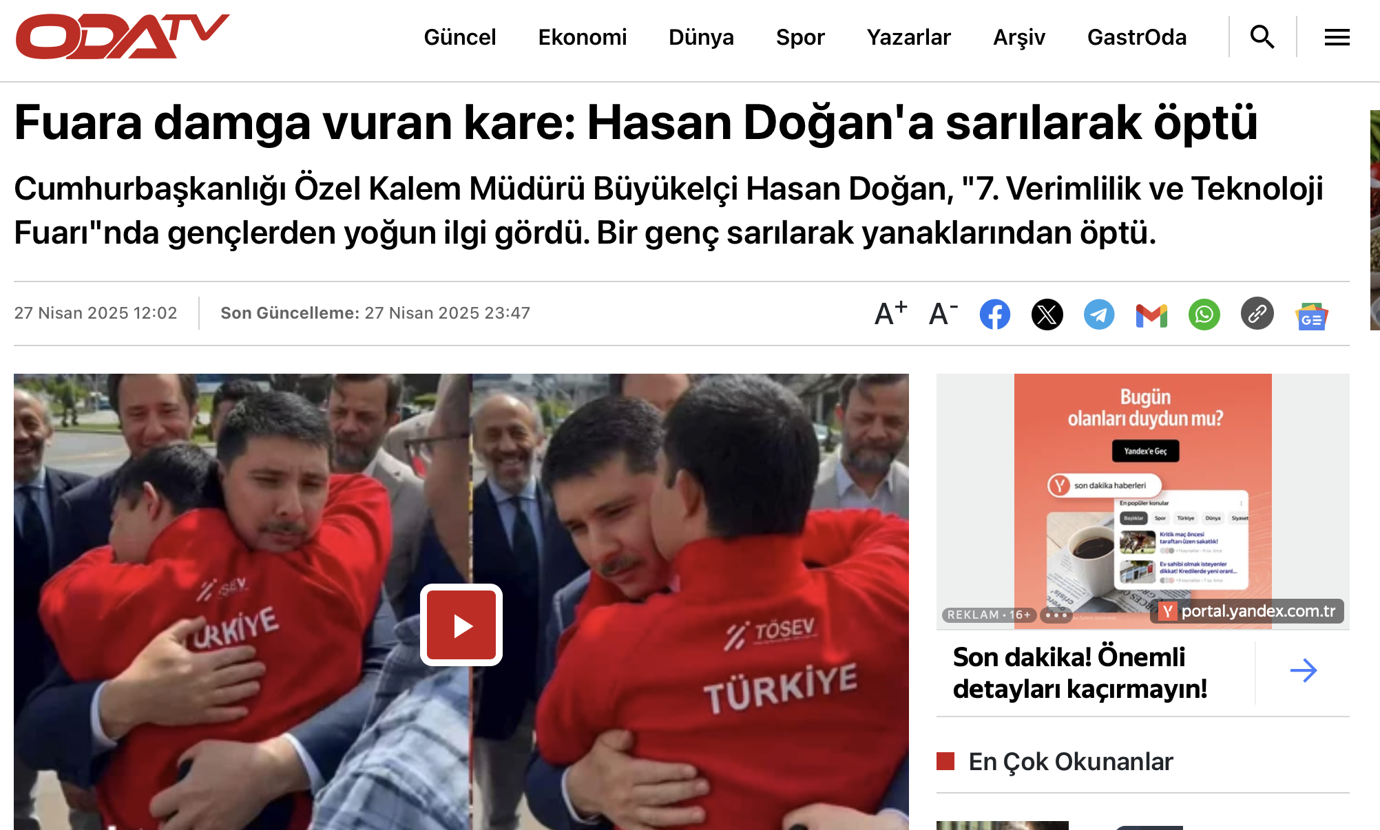 Ayrıca Oda TV geçen Nisan ayında “7. Verimlilik ve Teknoloji Fuarı”nda bir gencin Hasan Doğan’a sarılıp öpmesi, “Fuara damga vuran kare” diye haber yaptı.