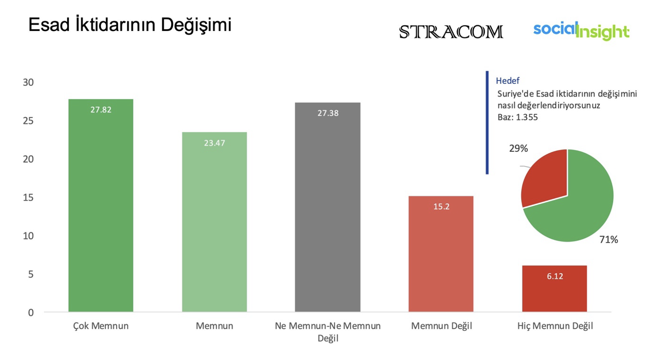 Araştırma ve danışmanlık şirketi Stracom tarafından yapılan ankete göre, katılımcıların %51.29’u Esad iktidarının değişiminden memnuniyet duyduğunu ifade etti. Buna karşın, %27.38’i “ne memnun ne de memnun değilim” diyerek nötr bir tutum sergiledi.