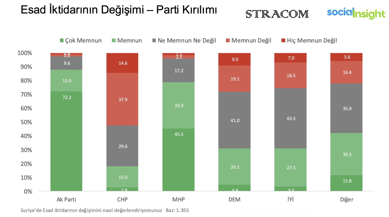 Cumhur İttifakı seçmeni arasında Esad’ın devrilmesine bakış olumlu iken, CHP seçmeninde bu oran düşük kaldı. CHP seçmeninin yüzde 52,5’i Suriye’deki iktidar değişiminden rahatsız olduğunu ifade etti.