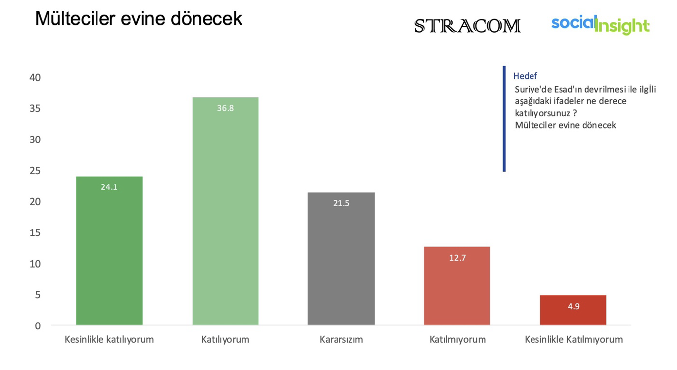 Ankete katılanların yüzde 61’i rejimin devrilmesinden sonra Suriyeli sığınmacıların evlerine döneceğine inanıyor. Geçtiğimiz hafta İçişleri Bakanı Ali Yerlikaya, Esad’ın devrilmesinden bu yana Türkiye’yi terk eden Suriyeli oranının iki katına çıktığını ve Türkiye’nin mültecilerin geri dönüşünü hızlandırmak için Hatay’da yeni bir sınır kapısı açtığını söylemişti.