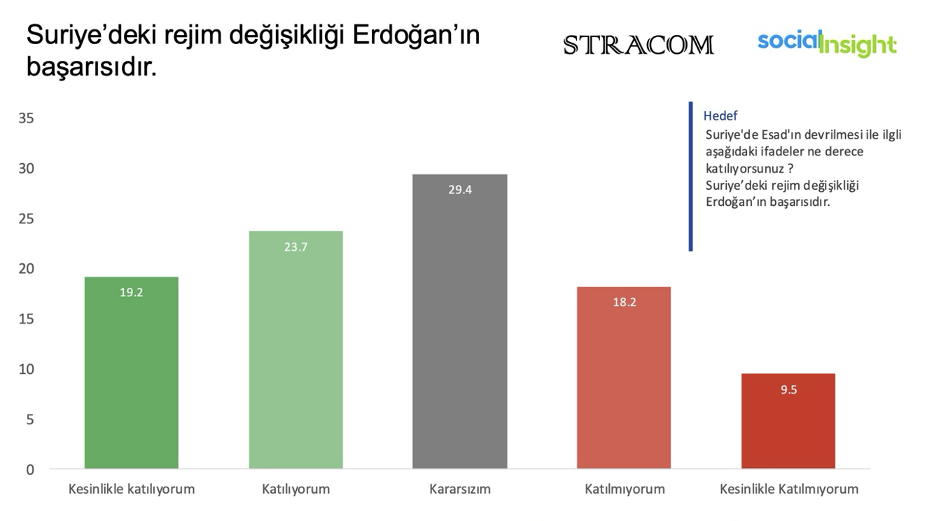 Ankete katılanların yüzde 43’ü Suriye’deki rejimin devrilmesini Cumhurbaşkanı Recep Tayyip Erdoğan’a atfediyor.