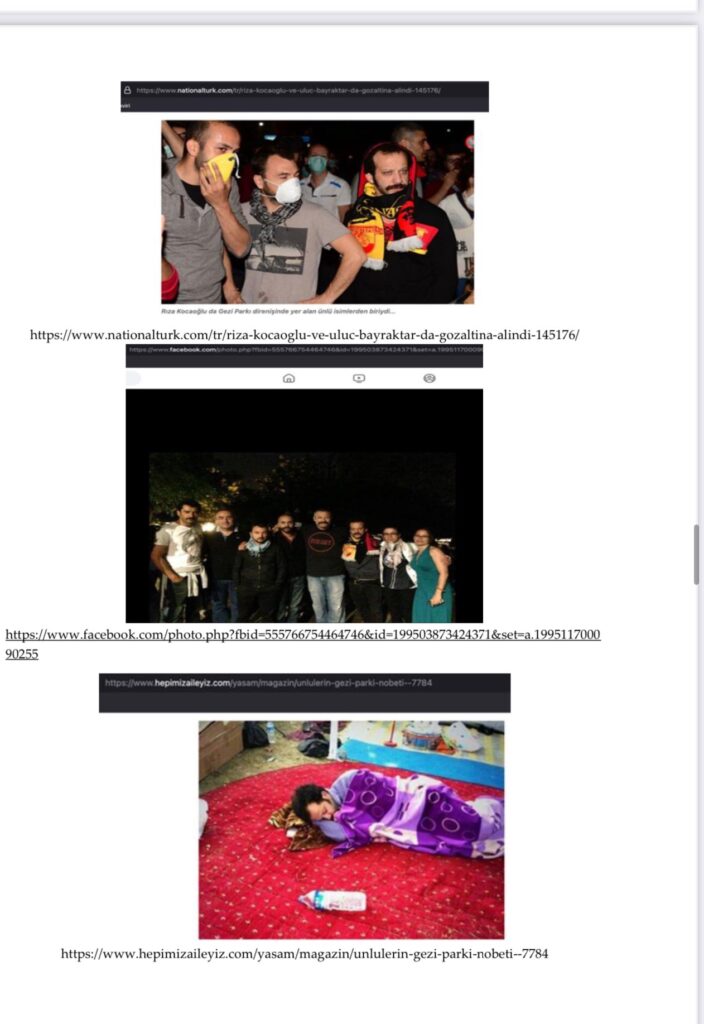 Nur Fettahoğlu, Selma Ergeç, Rıza Kolcuoğlu, Ali Atay, Şükran Ovalı, Zafer Algöz, Halit Ergenç, Ozan Güven gibi çok sayıda oyuncunun Gezi paylaşımları, fotoğrafları iddianamede yer alıyor.