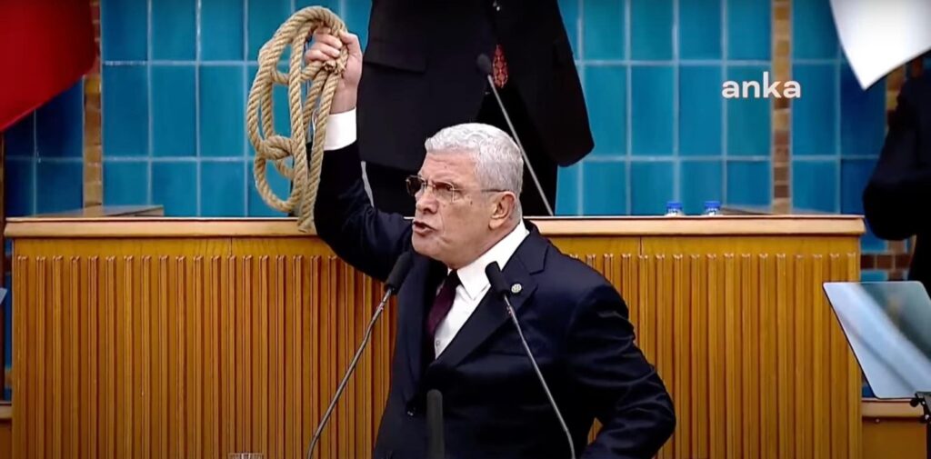 MHP lideri Devlet Bahçeli’nin “Öcalan” çağrısını İYİ Parti Genel Başkanı Müsavat Dervişoğlu, kürsüden ip fırlatarak protesto etti: