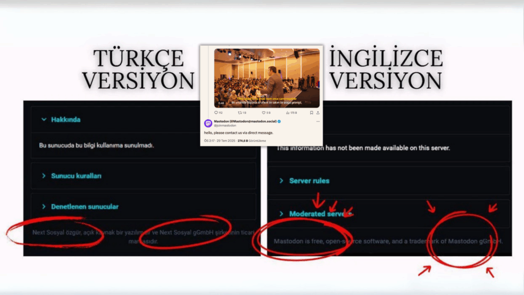 Platformun Türkçe versiyonunda Mastodon’a herhangi bir atıf yokken, İngilizce sürümünde Mastodon altyapısı kullanıldığı belirtiliyor.