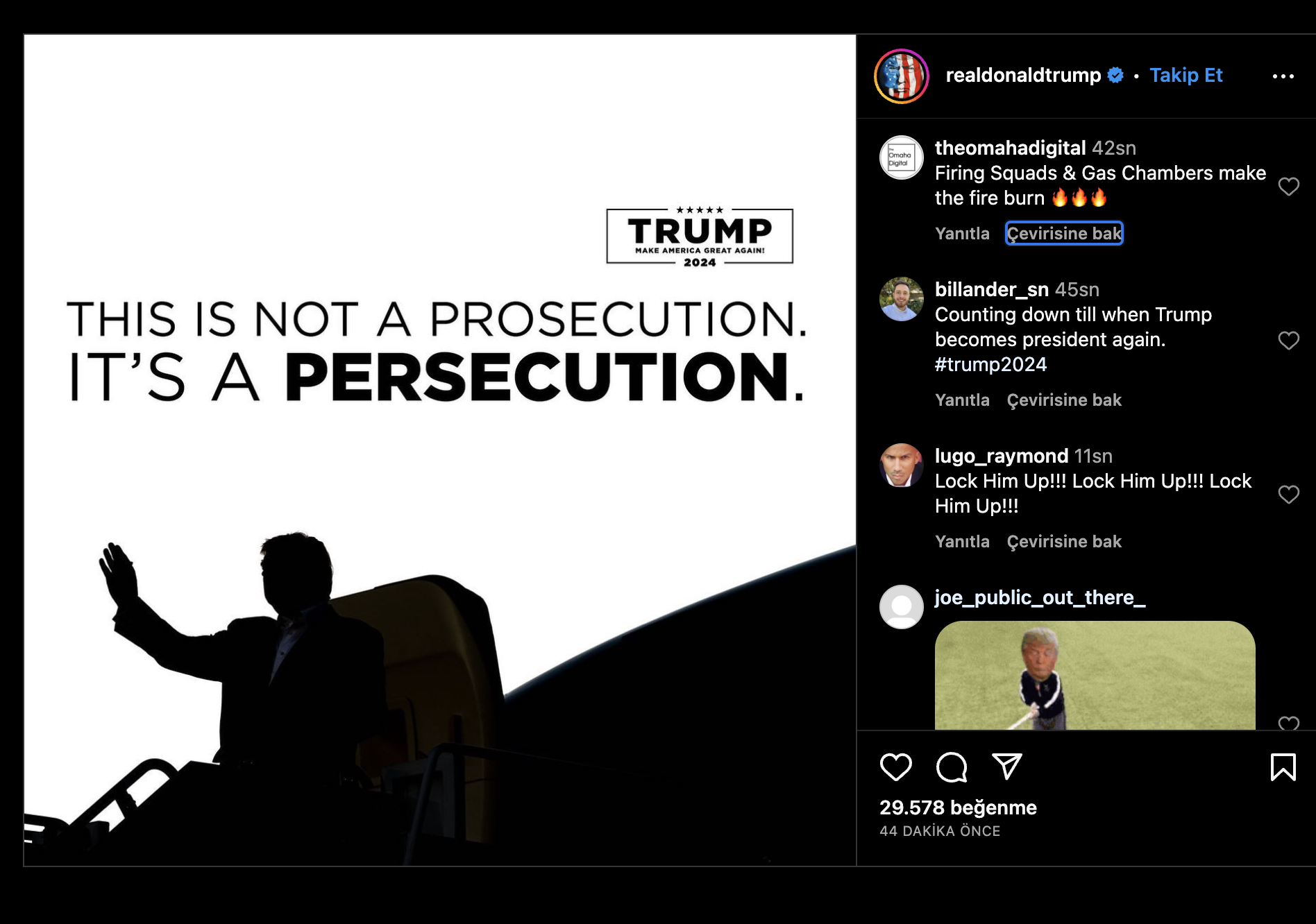 Trump halinden memnun. 2024 seçimleri için başkan adaylığını ilan eden Trump, Cumhuriyetçi Parti’nin başkan adayını belirlediği önseçimde davaların getirdiği mağduriyet ve popülerlik sayesinde en yakın rakibi Florida Valisi Ron DeSantis’in 40 puan önünde. Trump’a dava açıldıkça rakipleri ya Trump’ın arkasına dizilip destekliyor, ya da Trump’ı eleştirdiği veya yeterince desteklemediği için Cumhuriyetçi seçmenin tepkisini çekiyor. Örneğin, dün Fox’a çıkarak iddianamedeki suçlamaları doğrulayan, Trump’ın ve avukatlarının kendisinden seçim sonuçlarını geçersiz kılmasını talep ettiğini kamuoyuna açıklayan başkan adaylarından ve Trump’ın eski başkan yardımcısı Mike Pence aylardır %2-3’lük bir oy oranında seyrediyor. Cumhuriyetçi seçmen Trump’tan vazgeçmiyor. Fakat durum değişebilir. Çünkü Trump’a açılan davalar, ortalama ve makul seçmen nezdinde “radikal aday” algısını sağlamlaştırıyor, Ağustos ayında düzenlenecek olan Cumhuriyetçi adaylık münazarasında Trump’ın rakipleri davaları gündeme getirip “Trump ile seçimi kazanamayız” algısını pekiştirebilir.