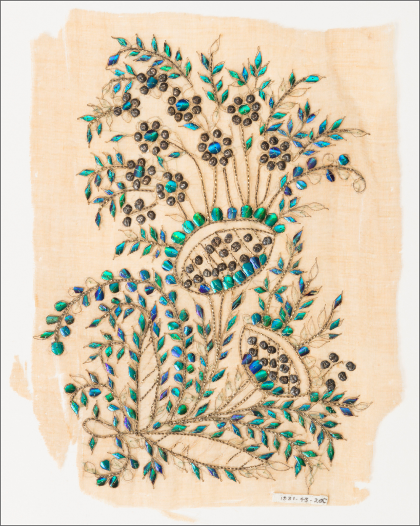 1700’ler sonu İngiltere’den ayakkabı, Hindistan’da işlenip gelen kumaşla yapılmış, Bata Shoe Museum. Üstteki ise 1800’lerin başı, çanta olmak üzere Hindistan’dan gelen bir kumaş, Museum of Fine Arts Boston.