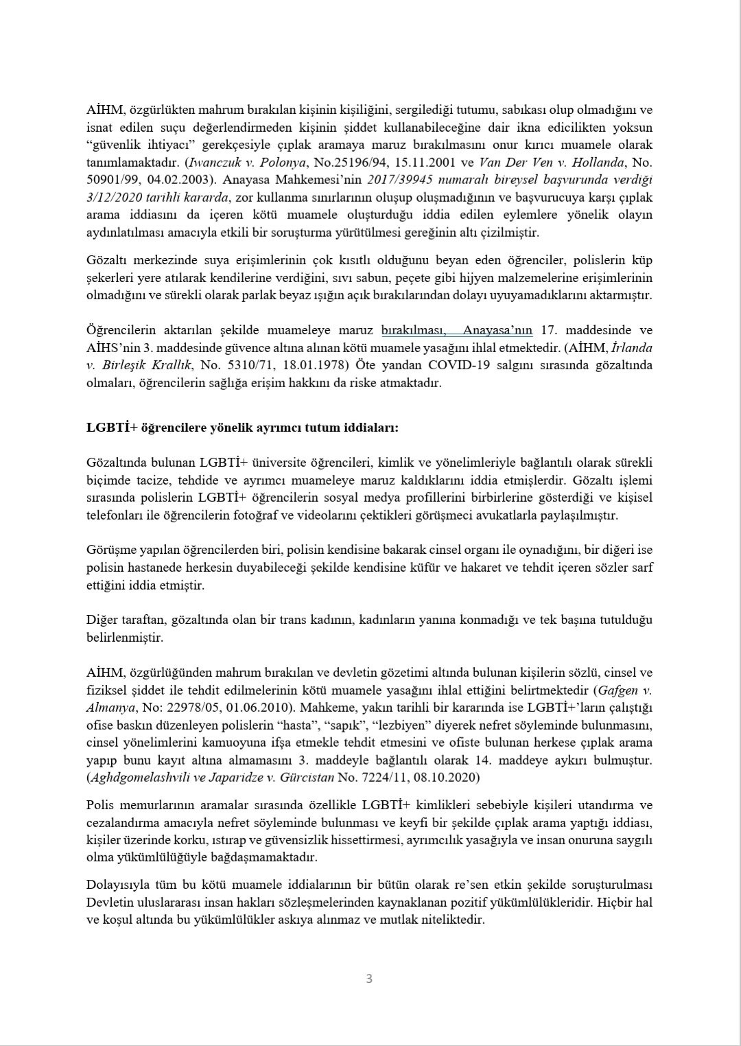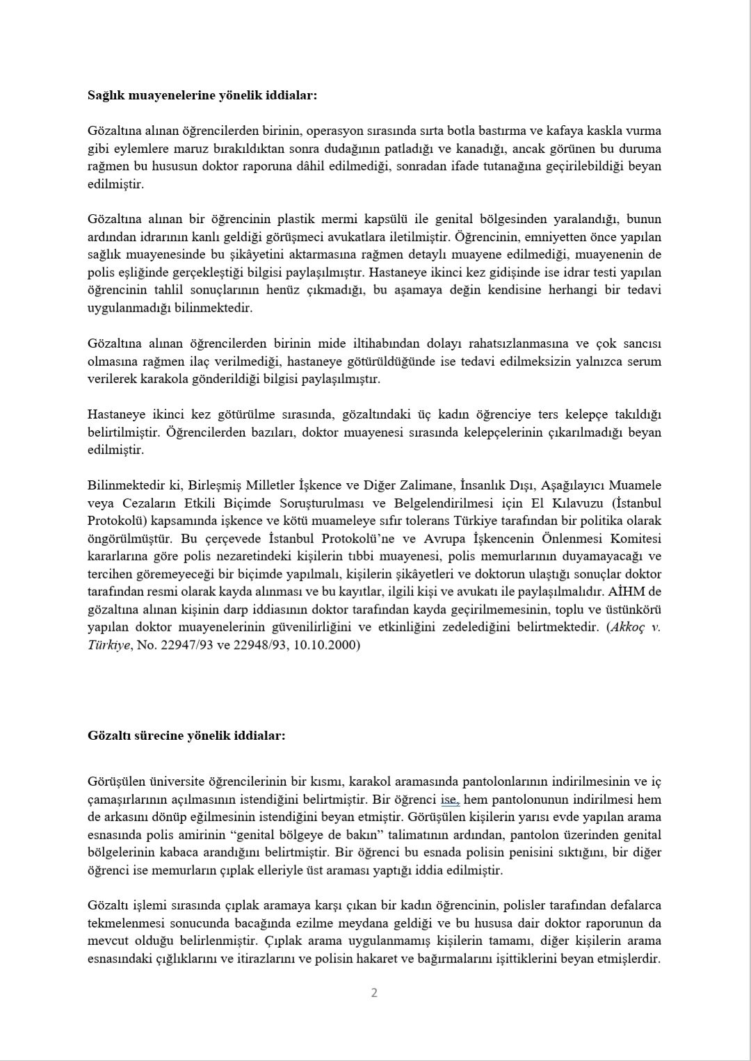 Gözaltındaki öğrencilerle görüşülerek hazırlanan raporda, ev baskını, aramalar,  sağlık muayenesi ve gözaltı aşamalarında  çok sayıda hak ihlâli yapıldığı tespiti yer aldı.