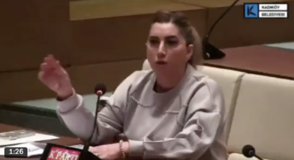 “Kadınlar günü konuşmamızı yaparken sözümüzü kesen ve mikrofonumuzu kapatan, ‘yayını kesin’ diye uyaran meclis başkanını kınıyorum. Konuşmanın sonunda “Şunu çıkaralım, atalım dışarı” diyerek bir kadına reva gördükleri muamele.”
