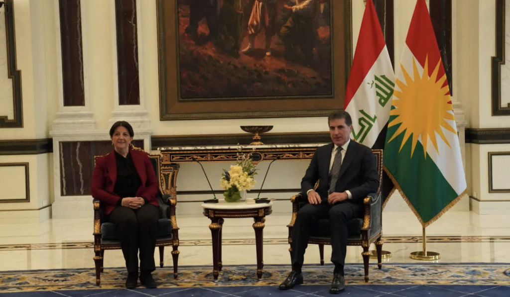 Erbil’de bulunan Pervin Buldan başkanlığındaki DEM Parti İmralı heyeti, Irak Kürdistan Bölgesi Başkanı Neçirvan Barzani tarafından kabul edildi.