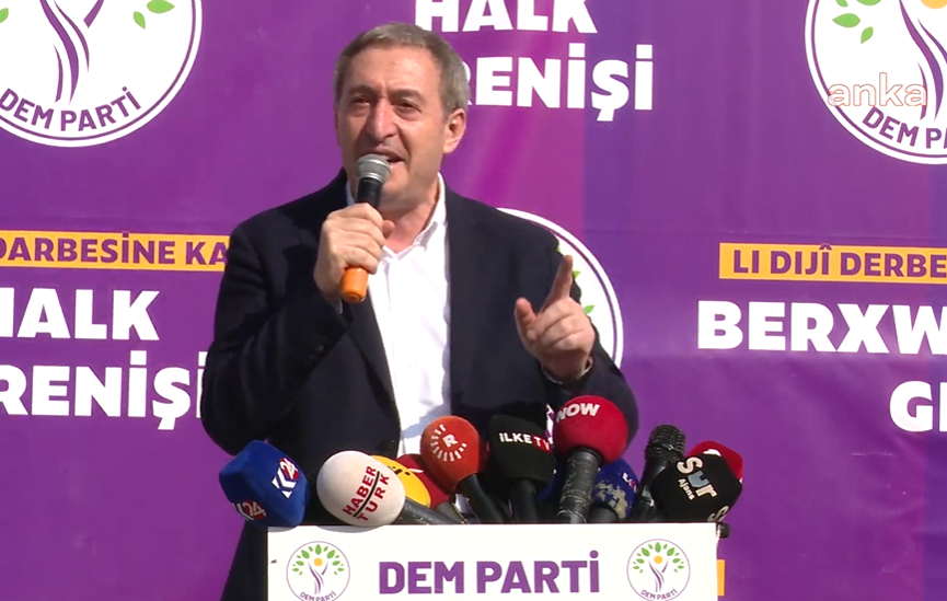 DEM Parti Eş Genel Başkanı Tuncer Bakırhan, kayyım atanan Mardin Büyükşehir Belediyesi önünde grup toplantısında konuştu.