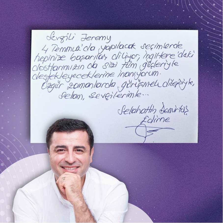 Jeremy Corbyn, Demirtaş’ın mesajını X hesabından “Haksız bir şekilde tutukluğunun devam ettiği Türk hapishanesinden yazdığı destek mektubu için Selahattin Demirtaş’a teşekkürler. Türkiye’de – ve dünya çapında – özgürlük, barış ve adalet için yürütülen mücadele galip gelmeli.”