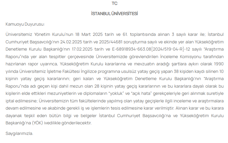 “Üniversitemiz Yönetim Kurulu’nun 18 Mart 2025 tarih ve 61. toplantısında alınan 3 sayılı karar ile; İstanbul Cumhuriyet Başsavcılığı’nın 24.02.2025 tarih ve … soruşturma sayılı ve ekinde yer alan Yükseköğretim Denetleme Kurulu Başkanlığı’nın 17.02.2025 tarih ve … sayılı ‘Araştırma Raporu’nda yer alan tespitler çerçevesinde Üniversitemizde görevlendirilen İnceleme Komisyonu tarafından hazırlanan rapor uyarınca, Yükseköğretim Kurulu kararlarına ve mevzuatın aradığı şartlara aykırı olarak 1990 yılında Üniversitemiz İşletme Fakültesi İngilizce programına usulsüz yatay geçiş yapan 38 kişiden kaydı silinen 10 kişinin yatay geçiş kararlarının; geri kalan ve Yükseköğretim Denetleme Kurulu Başkanlığı’nın ‘Araştırma Raporu’nda adı geçen kişi dahil mezun olan 28 kişinin yatay geçiş kararlarının ve bu kararlara dayalı olarak bu kişilerin elde ettikleri mezuniyetlerin ve diplomaların ‘yokluk’ ve ‘açık hata’ gerekçeleriyle geri alınmak suretiyle iptal edilmesine; Üniversitemizin tüm fakültelerinde yapılmış olan yatay geçişlerle ilgili inceleme ve araştırmalara devam edilmesine ve akabinde gerekli iş ve işlemlerin tesis edilmesine karar verilmiştir. Alınan karar ve bu karara dayanak teşkil eden bütün bilgi ve belgeler İstanbul Cumhuriyet Başsavcılığı’na ve Yükseköğretim Kurulu Başkanlığı’na (YÖK) ivedilikle gönderilecektir.”