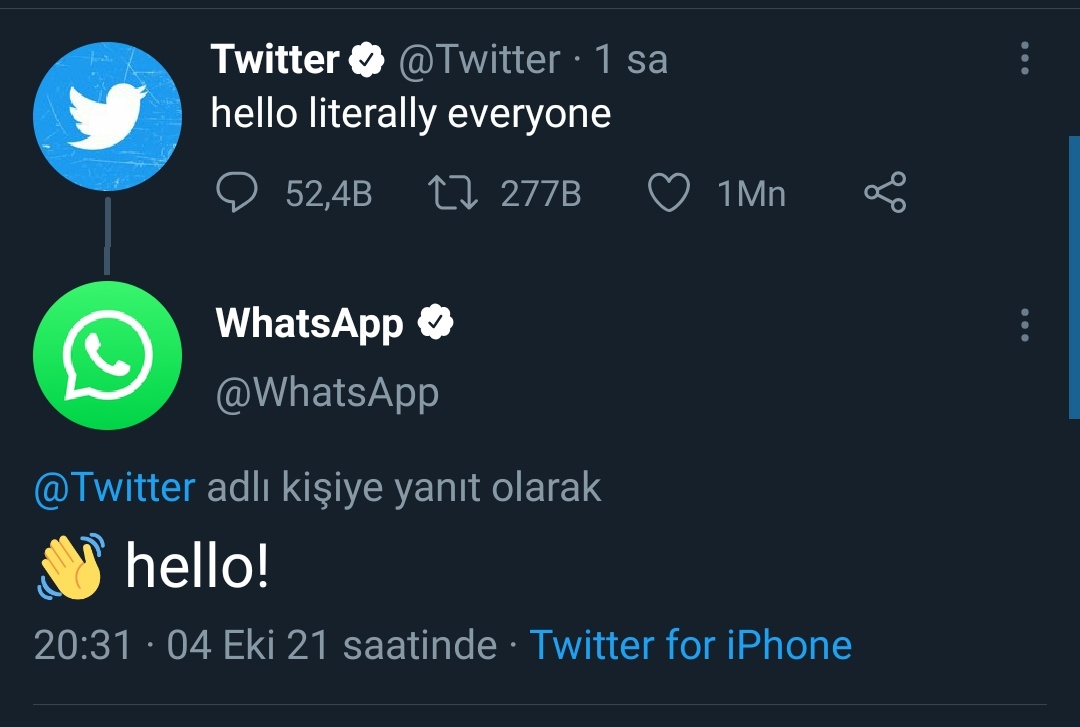 Twitter uygulamasının resmi hesabından ise, söz konusu üç platformun çökmesine ve kullanıcıların Twitter’a akın etmesine espirili bir yorum getirilerek, “Tam anlamıyla herkese selamlar” mesajı paylaşıldı.
