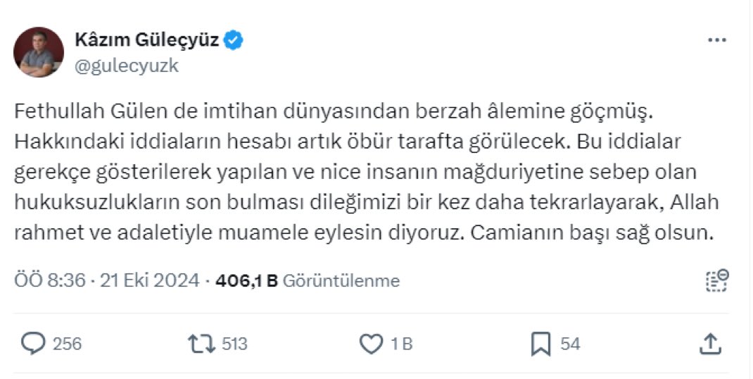 “Fethullah Gülen de imtihan dünyasından berzah alemine göçmüş. Hakkındaki iddiaların hesabı artık öbür tarafta görülecek. Bu iddialar gerekçe gösterilerek yapılan ve nice insanın mağduriyetine sebep olan hukuksuzlukların son bulması dileğimizi bir kez daha tekrarlayarak, Allah rahmet ve adaletiyle muamele eylesin diyoruz. Camianın başı sağ olsun.”