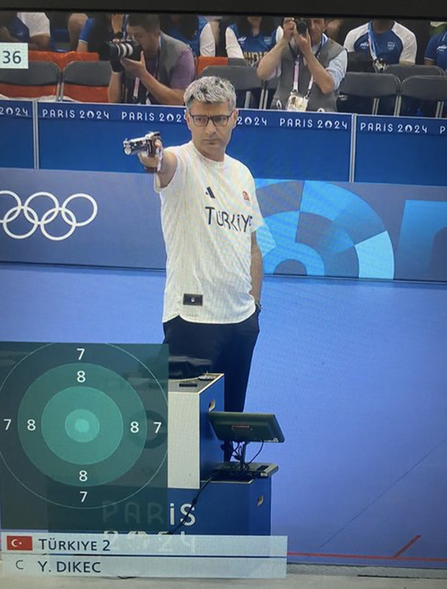 “Olimpiyat atıcılığında oyuncular en yeni ekipmanları kullanırlar ve Türkiye bir atıcı (Dikeç, emekli bir Türk askeri) gönderdi: