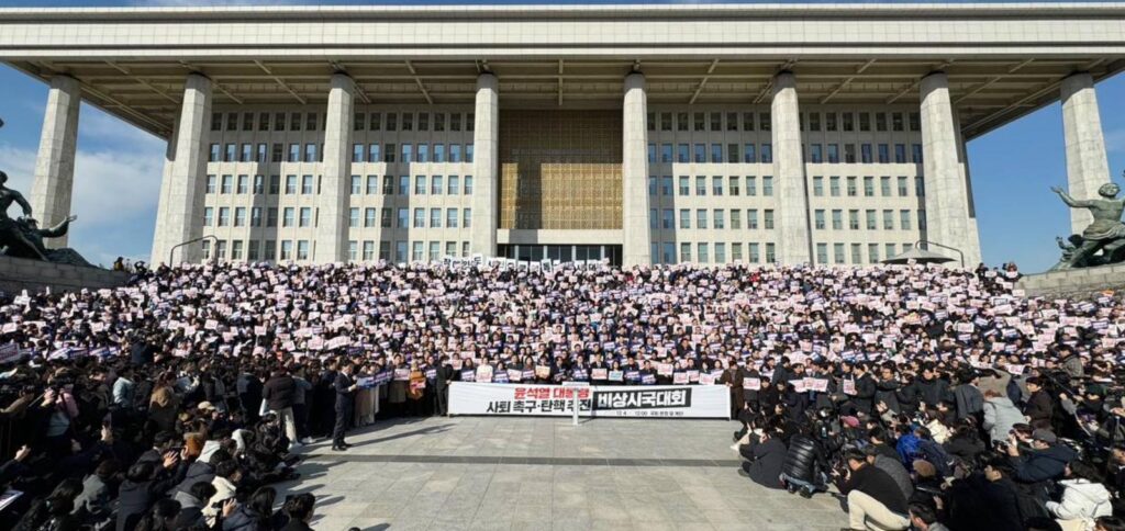 Parlamento binasının önünde Devlet Başkanı Yeol’u protesto eden vatandaşlar, “Yeol’ü tutuklayın” sloganları atıyor.