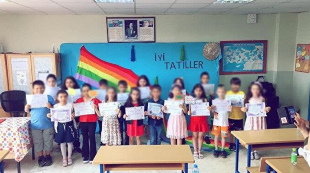 “Silivri Kavaklı İlköğretim Okulu’nda görevli ‘Ahter Nur’ isimli öğretmen karne günü küçük yaştaki öğrencilere LGBT paçavrasının önünde fotoğraf çektirdi. Skandal fotoğrafları kendi sosyal medya hesabından paylaşan öğretmen, okul müdürü ve velilerin tepkisi üzerine paylaşımlarını sildi.”