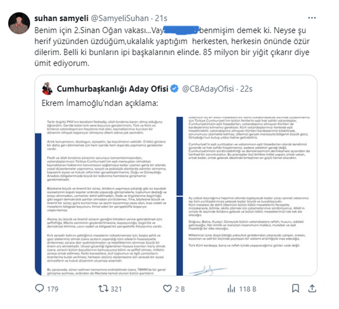 “Bu bir tasfiye değil, yeni pozisyonlanma hamlesidir. Lozan Antlaşması üzerinden statüsüz bırakıldıklarını ima ederek uluslararası kamuoyuna ‘haklılık’ zemini yaratılmak isteniyor. PKK kendini 40 Bin kişinin katili silahlı bir terör örgütü değil, ‘tarihsel ve hukuki temeli olan bir yapı’ gibi göstermeye çalışıyor.”