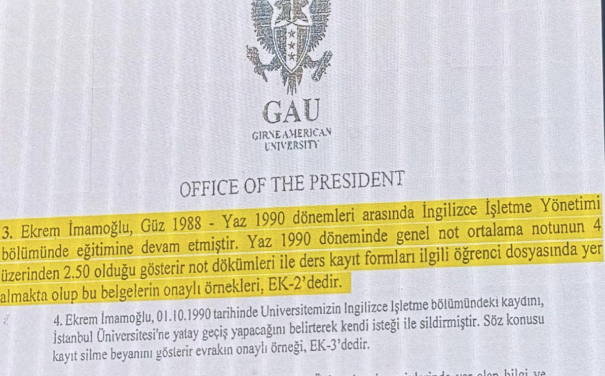 “YÖK, İmamoğlu aleyhine hangi veriyi ortaya koyuyor? 18 Kasım 1991 tarihli YÖK yönetim kurulu kararı ise şunu söylüyor: Girne Amerikan Üniversitesi’nin bağlı olduğu ABD’deki üniversitenin YÖK tarafından tanınırken, Girne’deki kampüsünün tanınmadığı belirtiliyor. İstismar konusu yapılan belge budur.