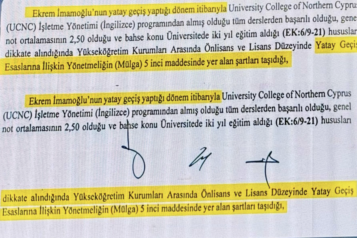“YÖK tarafından İmamoğlu ile ilgili hazırlanan bir rapor da vardır. İstanbul Cumhuriyet Başsavcılığı’nın talebiyle hazırlanan YÖK raporu, şunun altını çiziyor: İmamoğlu’nun yatay geçiş yaptığı dönem itibarıyla yatay geçişe ilişkin tüm şartları taşıdığı belirtiliyor.