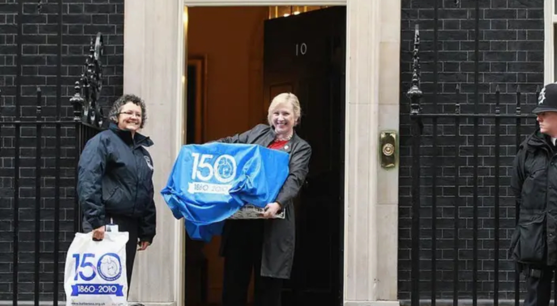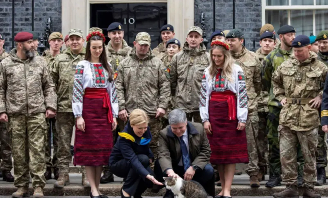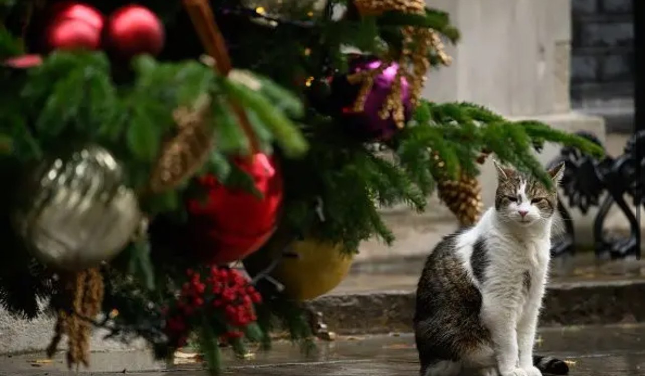 yazısı, Ukrayna’nın Birleşik Krallık Büyükelçisi Vadym Prystaiko (önde sağda) ve eşi Inna Prystaiko (önde solda), İngiliz ve Ukraynalı askerler ve sanatçılardan oluşan bir heyetin İngiltere Başbakanını ziyareti sırasında Larry ile tanışıyor. Rusya’nın Ukrayna’yı işgalinin birinci yıldönümü, 24 Şubat 2023.İngiltere’nin yeni Dışişleri Bakanı David Cameron ile Kasım ayında tanışmasından bir süre sonra Larry, ofisin dışındaki Noel ağacının yanında duruyor, 5 Aralık 2023.